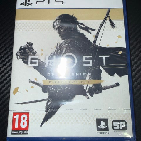 PlayStation Ghost of Tsushima Director’s Cut PS5 spill. Fysisk utgave på disk til PlayStation 5, levert i original blå PS5-eske med omslag. Spillet er merket 18-års aldersgrense (PEGI 18). Inneholder Director’s Cut-versjonen av Ghost of Tsushima, utviklet av Sucker Punch Productions, tilpasset PlayStation 5-konsoll.