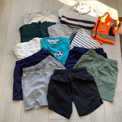 gutteklær i størrelse 104 i flerfargede varianter. Pakken inneholder ulike plagg som blant annet t‑skjorter, gensere, shorts og skjorte i forskjellige farger og motiver. Klærne passer til gutt med klesstørrelse 104 og kan brukes til både hverdags og barnehage. Materiale er typisk bomullsblandinger, egnet til vanlig bruk og maskinvask.
