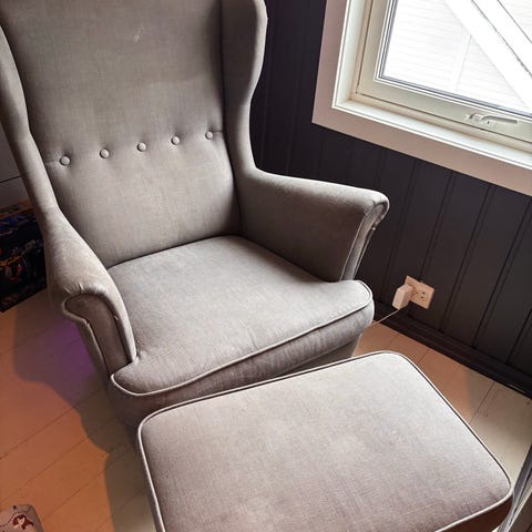 Pent brukt lenestol med fotskammel fra dyr og røykfritt hjem. Utgått modell - STRANDMON