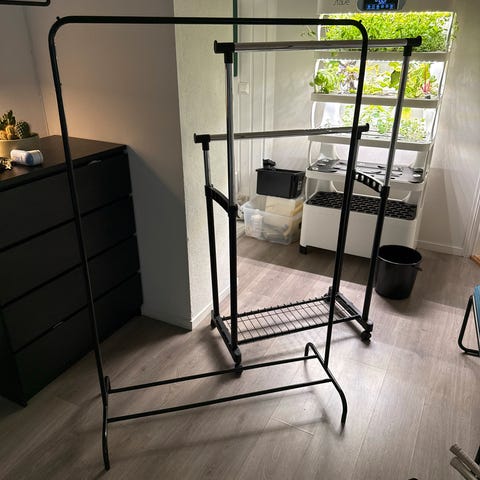 Klesstativ i svartlakkert metall med hyllebord og bokser.