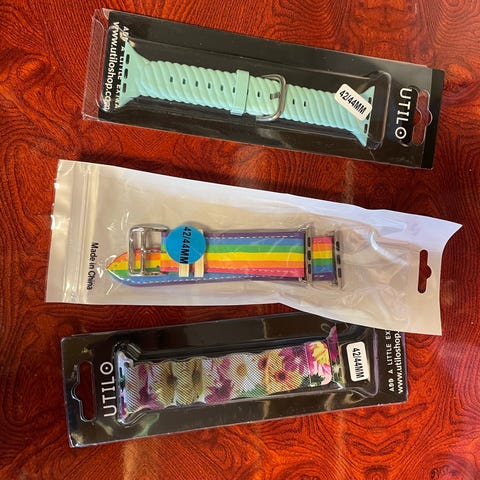 Apple remmer til Apple Watch i flere farger. Pakken inneholder ulike remmer som passer til Apple Watch, i blant annet rosa, blå og burgunder. Remmene er laget for å kunne byttes enkelt på klokken og gir mulighet til å variere utseendet etter behov. Egnet for bruk med kompatible Apple Watch-modeller som støtter denne typen festemekanisme.