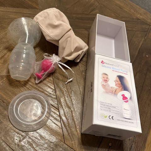 NatureBond manuell brystpumpe med silikonpumpe og oppsamlingsbeholder. Leveres med stoffpose til oppbevaring og original eske.