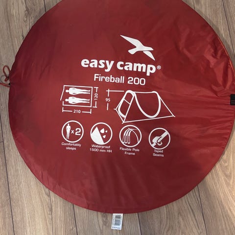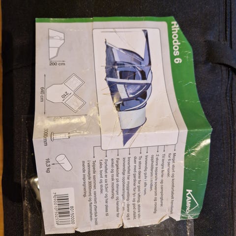 Fint brukt, gammel modell. Mangler ei hempe for å feste innerteltet i ytterteltet i eit hjørne. Kan sikkert fikses med nål og tråd. Har ikkje våre problem for oss å bruke det likevel.
