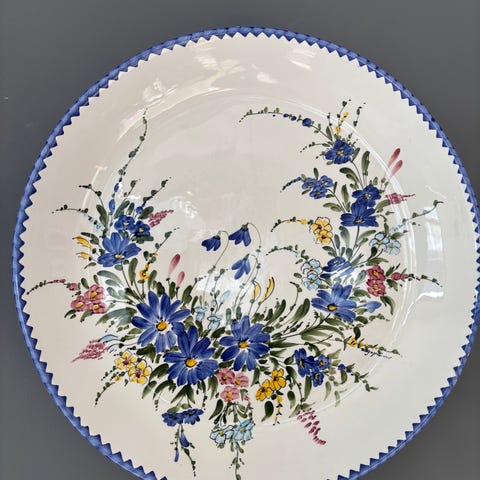 Dekorfat eller serveringsfat i keramikk med håndmalt, geometrisk mønster i røde, sorte, grønne og gylne toner. Fatet har oval midtflate med rutemønster og dekorert kant rundt. Baksiden er glasert og merket med modellnummer og «Norway». Leveres med oppheng på baksiden, slik at det kan brukes som veggdekor eller som liggende dekorfat på bord eller hylle. Mål: 39,5 x 34 cm.