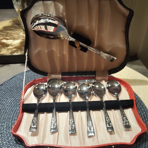 12 skjeer I nysølv, alphaka, 21 cm lange , kr 600+ porto