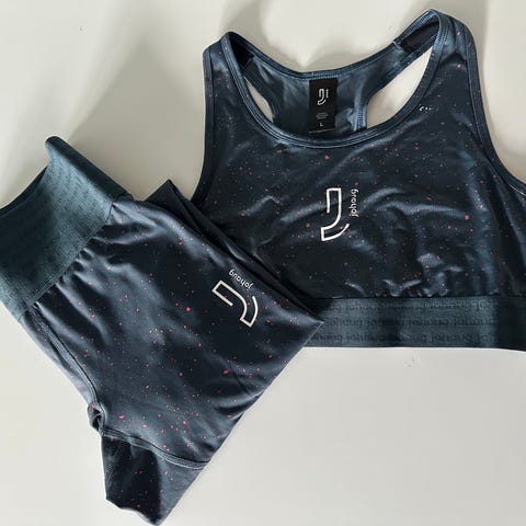 Johaug treningstøy sett i størrelse L unisex. Sett med kortermet treningsoverdel i rosa med mønstrede ermer og tilhørende mønstrede tights/bukse. Elastisk materiale som egner seg til ulike typer trening og aktivitet innendørs og utendørs.