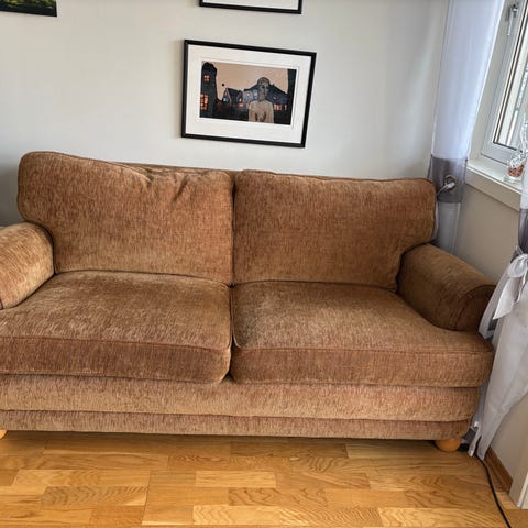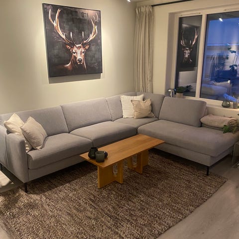 Ca 10 år gammel hjørnesofa med noen bruksmerker. Er en revnet søm se bilder. Merket på sofa er hjort knudsen . Dansk sofa produsent