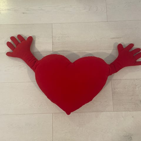 hjerteformet dekorpute laget av stoff. Puten har en kombinasjon av stripete og ensfarget mønster i nøytrale farger, med en dekorativ snor knyttet rundt. Egnet som interiørdekorasjon.