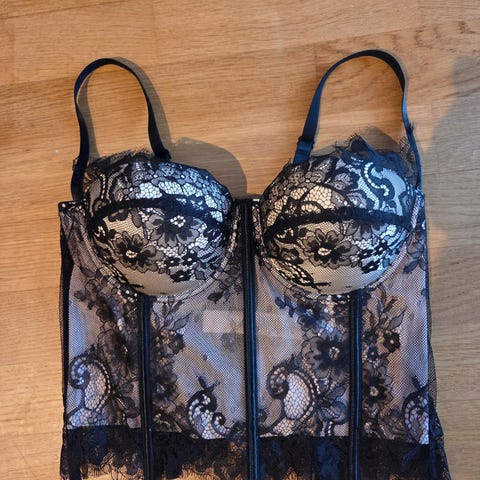 Korsett med spiler, lys grønn med svart trim. Brukt til kostyme. Litt slitasje på snor, ellers i pen stand. Vet ikke størrelse, ca 77 cm i omkrets. Stoffet er ikke elastisk. Metallhekter fremme og snøring i ryggen.