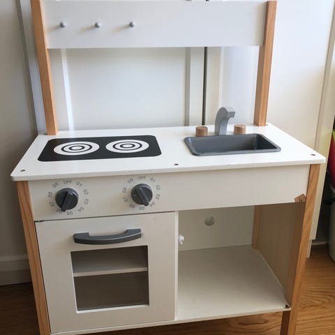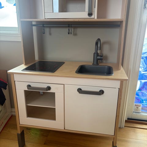 Lekekjøkkenet har toppseksjon med hylle og mikrobølgeovn med dør som kan åpnes og lukkes. Under er det oppheng for kjøkkenredskaper. Benkeplaten har platetopp med to «kokeplater» og en vask med kran. Nederst er det skapplass med hylle og dører, hvor den ene har vindu som etterligner stekeovn.