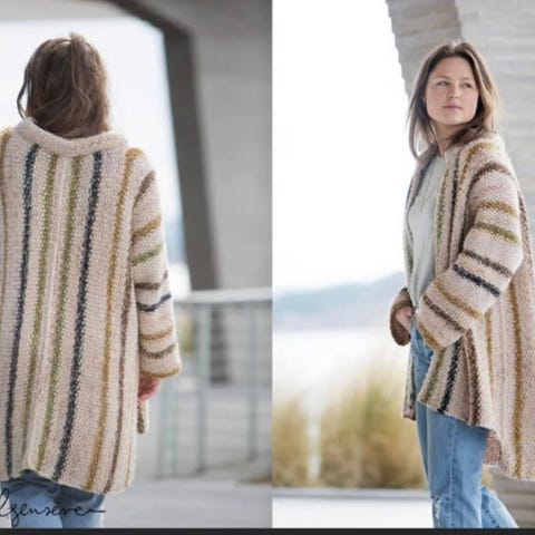 Skappel cardigan , Iris, for dame i størrelse M/L. Cardiganen er strikket i Spinnvill , norsk lammeull, og har en beige farge. Den har rund hals, knappestolpe med knapper foran og et tydelig flettestrikkmønster. Passer som varm og myk ytter- eller mellomlag i hverdagen.