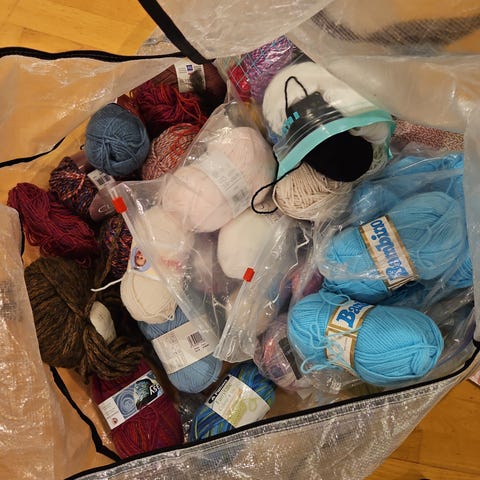 Blandet garnpakke med nøster i ulike farger og tykkelser. Garnet ligger sortert i plastposer og papirpose. Flere typer garnkvaliteter ser ut til å være inkludert, egnet til strikking eller hekling av for eksempel klær, tilbehør og interiørprosjekter. Passer for den som ønsker et utvalg garn til forskjellige håndarbeidsprosjekter.