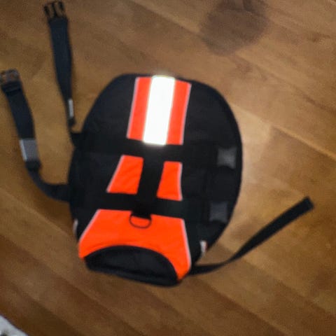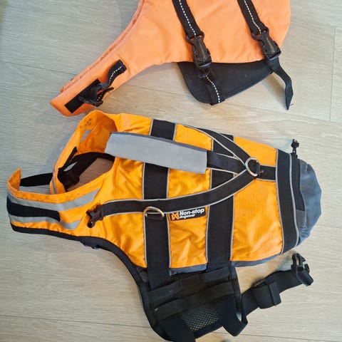 Selger en brukt non stop redningsvest brukt til dvergpincher. Som du ser på bildet så røyk den snora som skal være foran brystkassa. Sikkert lett å fikse for de som kan sy.