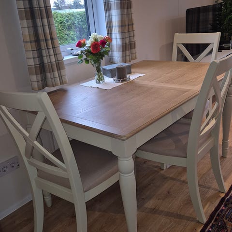 Det selges også spisebord med to ileggsplater og vitrineskap i samme serie, se egen annonse. Samlepris kan vurderes.
