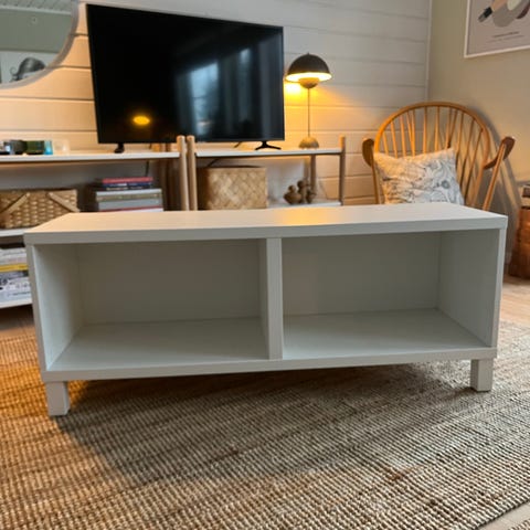 Veldig hel og fin hvit tv benk med skrå bein. Kjøpt på Fagmøbler.
