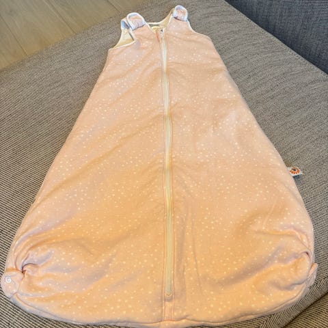 Veldig funksjonell sovepose. To-veis glidelås foran. Trykknapper både over skuldrene for enkel av- og påkledning, samt justering nederst slik at posen kan brukes både som hel sovepose og med åpning til ben.