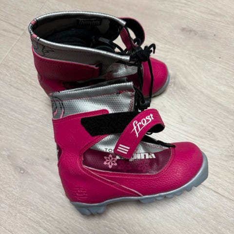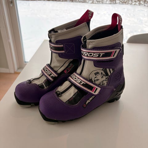 Godt brukte langrennsko til barn, str 34. Godt brukt, men har fortsatt noen skiturer igjen i seg. Ullsåle følger med.