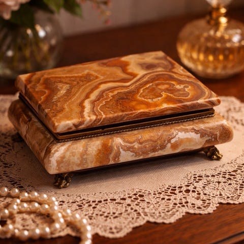 Selger et smykkeskrin eller oppbevarings skrin laget av onyx eller alabaster.
