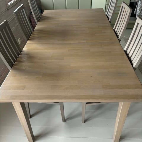 Eikebord selges. Følger med en ekstra bordplate som kan monteres på begge sider av bordet.