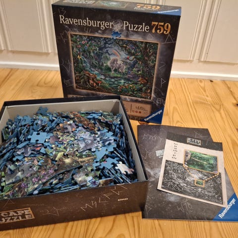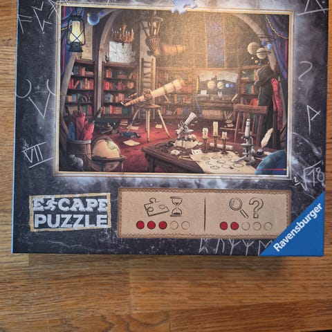 Ravensburger Escape Puzzle puslespill. Motivet viser et detaljert rom fylt med ulike gjenstander og ledetråder, og puslespillet kombinerer klassisk pusling med elementer fra escape room-spill. Esken inneholder puslespillbrikker og oppgaver som skal løses ved å studere motivet nøye. Egnet for ungdom og voksne som liker logiske oppgaver og puslespill.