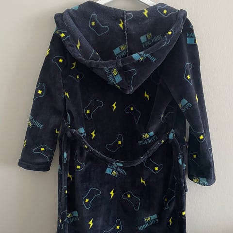 Pent brukt morgenkåpe i fleece fra KappAhl. Str. 158/164. Gaming motiv på morgenkåpen.