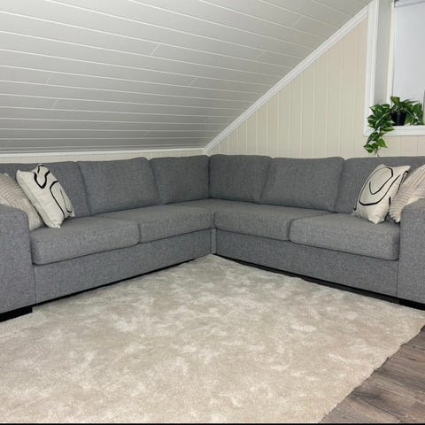 Bohus sofa med sjeselong i grått trekk. Sofaen har rette linjer og løse sitte- og ryggputer. Sjeselongdelen gir ekstra ligge- og sitteplass. Passer som hovedsofa i stue eller TV-stue. Nøytral gråfarge gjør at sofaen enkelt kan kombineres med ulike interiørstiler og farger på tepper og bord.