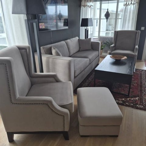 Klassisk sofa med pent slitesterk salongbord og lenestol. Selgers komplett for kr 5000