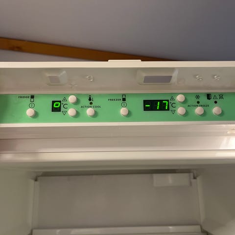 Kjøledelen har flere glasshyller og en grønnsaksskuff nederst, samt hyller i døren for oppbevaring av flasker og mindre varer. Frysedelen er plassert øverst og har trådhyller for enkel organisering av frosne varer.