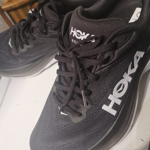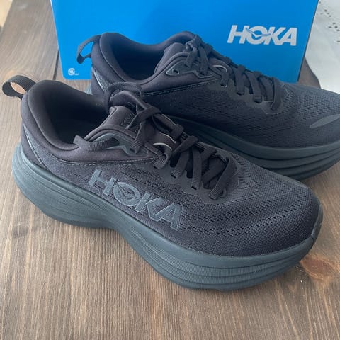 Hoka Bondi 8 joggesko i størrelse 38. Modellen har overdel i pustende mesh i svart farge med lisser. Tykk, dempet mellomsåle i hvit farge gir myk støtdemping ved gange og løping. Yttersåle med mønster for godt grep på ulike underlag. Egnet som joggesko eller til hverdagsbruk.