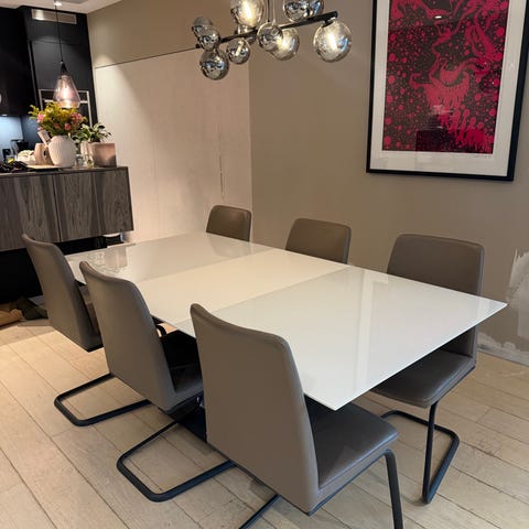 Spisebord har integrert innleggsplate som øker lengden til 264 cm. 6 solide stoler i skinn. Ny pris 65.000,-