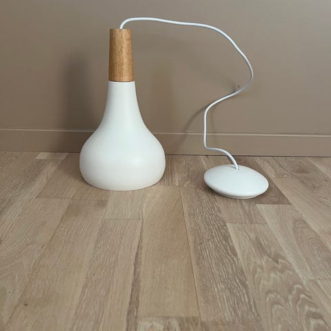 «Designer Ilse Crawford har laget denne lampa av bambusnetting. Det vevde materialet gir en varm, innbydende glød og kaster dekorative lysmønstre i rommet. Hver lampe er håndlaget og unik.»