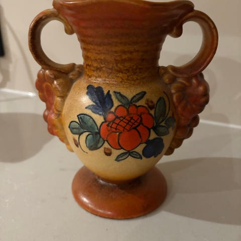 Keramikkvase med hank i brun og oransje glasur. Vasen har en dekorativ, buet hank og en form med smal hals og bredere midtparti som går inn mot en rund fot. Glasuren har drypp-effekt i overgang mellom fargene. Antakelig fra tyske Carstens Tönishof. Ordentlig RETRO. Ca. 20,5 cm høy, i veldig pen stand og uten feil.
