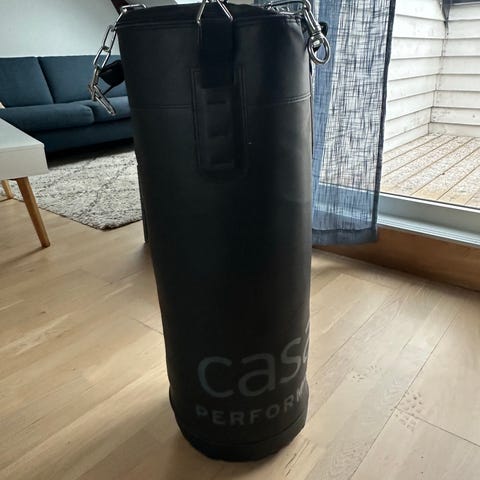 Champ boksesekk i beige tekstil. Sekken har snørelukking øverst og trykket Champ-logo i rødt på utsiden. Egnet til boksing og treningsøvelser hjemme eller på treningssenter, avhengig av oppheng og ønsket bruk.