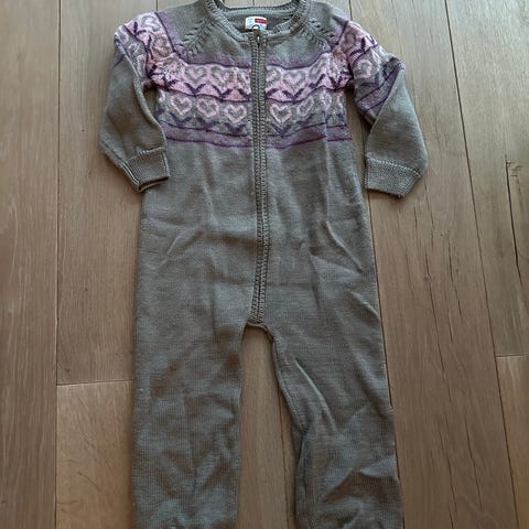 Name it ull heldress for barn i størrelse 98. Heldressen er i lilla med mønster og er laget av ull. Passer til hverdagsbruk eller som ekstra lag på kjølige dager. Glidelås foran og lange ermer og ben gir god dekning og komfort. Som ny