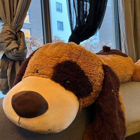 Bamse kosedyr formet som en liggende hund i brun farge. Myk plysj med lange ører og liten hale. Passer som koseleke for barn eller som pynt på barnerom.