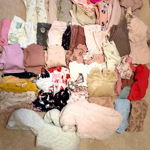 Pakken består av en god blanding av klær med ulik historikk. Noe er godt brukt av flere barn, noe er hjemmelaget, mens andre plagg fremstår som relativt ubrukte. Her får du mye klær for pengene, men du må påregne normal bruksslitasje på enkelte plagg.