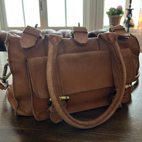 Lite slitasje, men en skade på glidelås på siden av vesken, se bilder. Nærbilde av reparasjon med nål og tråd - funker fint.