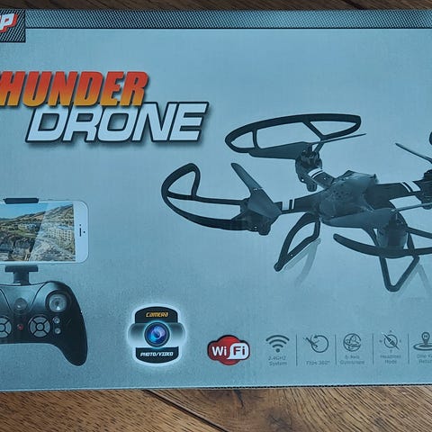 Selger uåpnet eske med drone. Esken er ca 17×28 cm, så det gir en ide om størrelsen på dronen.