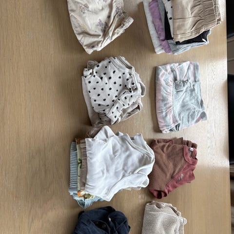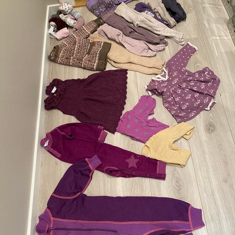 Pakken består av en god blanding av klær med ulik historikk. Noe er godt brukt av flere barn, noe er hjemmelaget, mens andre plagg fremstår som relativt ubrukte. Her får du mye klær for pengene, men du må påregne normal bruksslitasje på enkelte plagg.