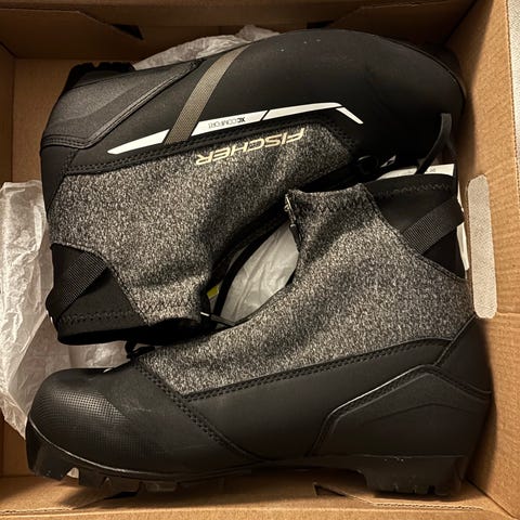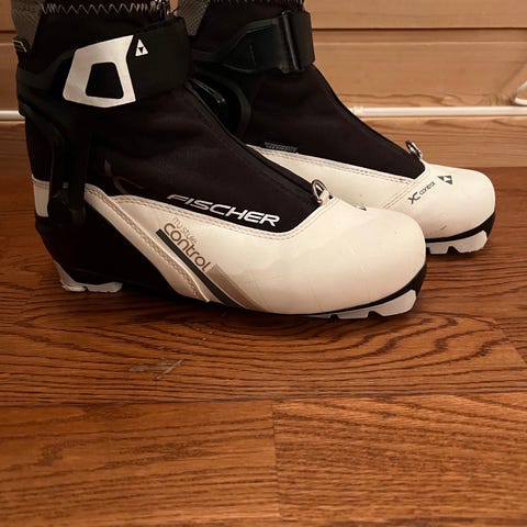 Fischer langrennsstøvler i størrelse EU 38 (UK 5, USW 7 1/2). Støvlene har overdel i syntetisk materiale med glidelås og beskyttende gamasje over vristen. Hælkappe og ankelstøtte i plast gir ekstra stabilitet. Hvit og svart med noen grå detaljer. Beregnet for bruk til klassisk langrenn eller turbruk,