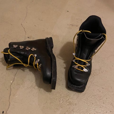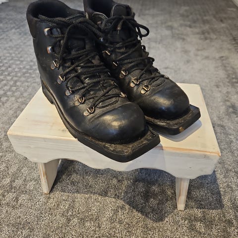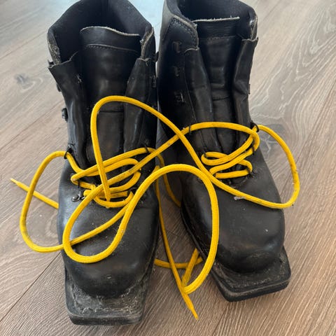 Retro turskistøvvel str. 38. I svart lær med gule lisser. Kraftig såle og metallhekter for snøring. Skoene har ankelhøy passform og polstret kant rundt ankelen for bedre komfort. Egnet til 75mm fjellski. Eller som pynt. Hele støvelen av lær i høy kvalitet. Støvlene trenger en puss, men er i god stand. Ps. Mange kaller skistøvler for skisko.