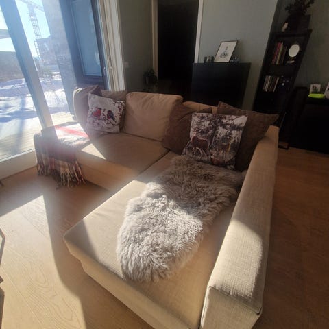 Godt brukt hjørnesofa med sjeselong. Noen synlige flekker, men putetrekk har glidelås og kan tas av.