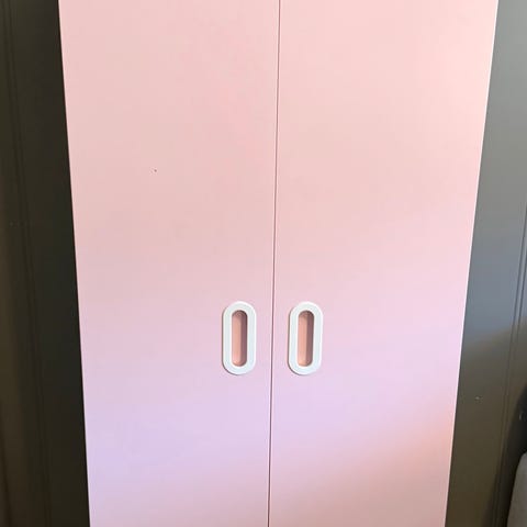 Selger et pent og praktisk IKEA barneskap (STUVA/SMÅSTAD-type) i lyserosa med hvite knotter. Smart og plassbesparende løsning som gir både heng og skuff/kurv-oppbevaring – perfekt til barnerom.