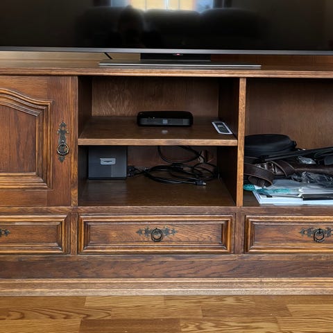 Alle de fire skapene er helt like. Har en hylle hver, er brunbeiset og laget i solid treverk. Passer kjempefint til hobbyrom eller bod. Vi har også brukt dem som TV-benk, til brettspill og hobbysaker.