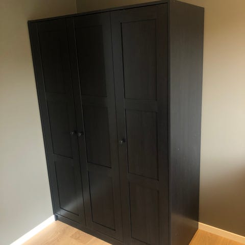 Selger et PLATSA skap fra IKEA med SMÅSTAD fronter. Malt med Jotun Lady interiørmaling, farge dempet sort. Det var festet en knaggrekke på ene siden, og det er derfor to små skruehull der. Skapet er i god stand og det medfølger en hengende hylle som kan brukes inni, se bilde. Denne varianten har tre skuffer, to små og en større.
