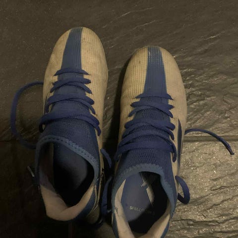 Nesten ubrukte Adidas X fotballsko i størrelse 40 2/3. Skoene har overdel i syntetisk materiale i grønn farge med blå detaljer og lisser. Yttersålen har faste knotter som er egnet for spill på gress og kunstgress.