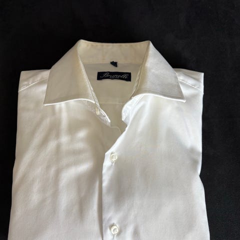 Dressmann skjorte for herre i størrelse L. Skjorten er hvit og laget av bomull. Den har kontrastfarget innside av kragen med småmønstret stoff og knapper med blå detaljer. Passer til både hverdagsbruk og mer formelle anledninger. Den e fin, og lite brukt, men den har fått noe sort inn i kanten ved knappene under vask, sikkert bare rester av stoff, men ble ikke så pent lenger