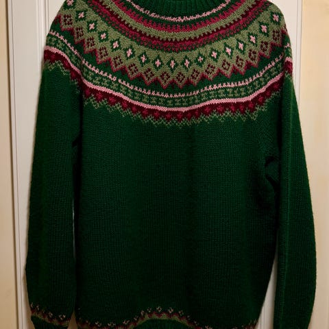 Pent strikket jakke som gir et litt retro uttrykk. Mosegrønn med litt brunskjær.