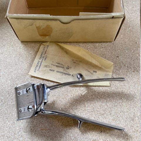 Dette er en vintage manuell hårklippemaskin av merket "Marke Fass" (Barrel Brand) fra Daniel Peres i Solingen, West-Germany.