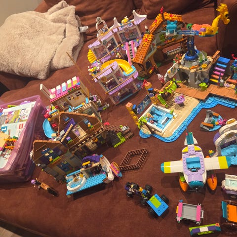 2 kasser med lego friends, mye ferdig bygget og helt, noe løst. Ikke synlig brukt